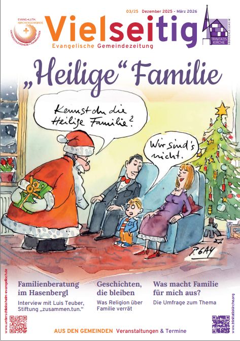 Unser Gemeindemagazin „Vielseitig“ erscheint dreimal im Jahr (April, August und Dezember). Jedes Heft widmet sich einem Thema und beleuchtet es aus verschiedenen Perspektiven. Daneben informieren wir natürlich auch über die aktuellen Veranstaltungen unserer Kirchengemeinde.